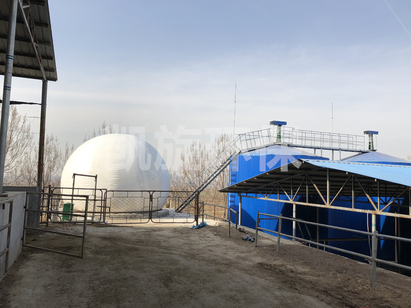 雙層膜沼氣罐外型為3/4球體,由鋼軌固定于水泥基座或厭氧罐罐頂上。主體由特殊加工聚酯材質(zhì)制成,罐體由外膜、內(nèi)膜、底膜(地上柜)及附屬設(shè)備組成,具有抗紫外線及種微生物的能力,高度防火并符合標(biāo)準(zhǔn)。